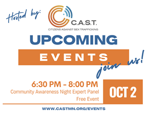 Our 3 panelists represent MN Safe Harbor, the BCA, Terebinth Refuge and event is hosted by Chamber Member Citizens Against Sex Trafficking (C.A.S.T.). We are better together, and together we can end exploitation BEFORE it begins!